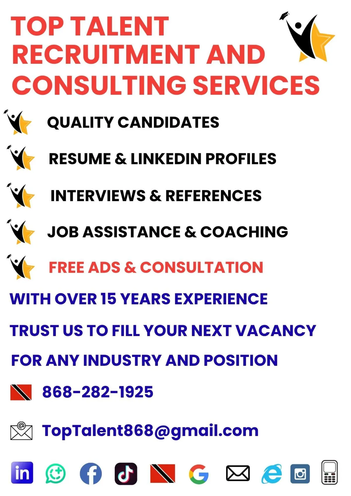 Top Talent Recruitment & Consulting Services was founded with one mission: to help companies in Trinidad & Tobago and the Caribbean connect with qualified, job-ready professionals — quickly and confidently.